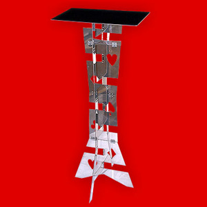 The magician walks, with a newspaper under his arm, towards the middle of the stage. Suddenly he produces from the newspaper a real table, complete with four legs. So, he uses it to place his magic tricks and start the performance. - The table is made of stainless steel. The table top is covered with velvet. - Closed it measures cm 34 (l) x 1,5 (h) x 22 (w) while open its height is about cm 76. - Being very light, and with a small thickness, you can make it appear from a jacket, a newspaper, a production tool, etc.