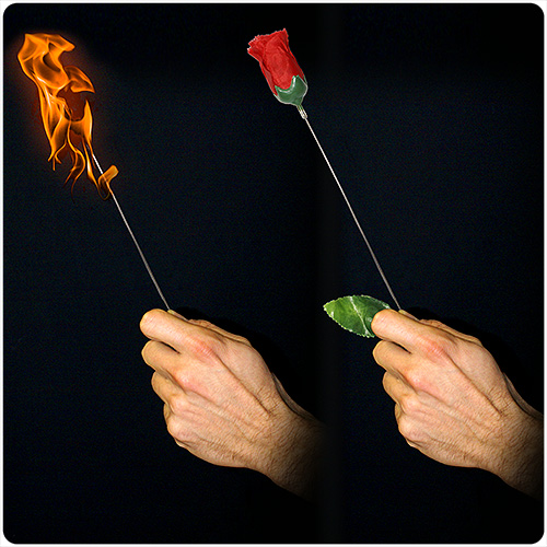 A lit flaming torch instantly changes into a beautiful rose. The rose then uncannily starts to rise in the performers had. A highly visual and romantic effect! - Two great effects combined. - The rose (stem and flower) is 36,5cm (14,4”) long - The effect is easy to perform, and will have a great impact on any kind of audience.