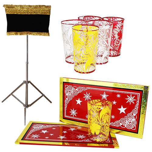 The magician shows two flat panels on both sides. He places them together and magically makes a glass appear from nowhere. The glass is set aside on a table. Then he shows the panels once again, places them together again, and makes a second glass appear. This action is repeated until at the end the magician has made 6 glasses appear! To finish, the magicians fills the glasses and toasts to the applause of the audience.
