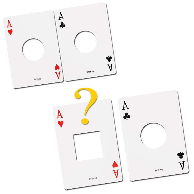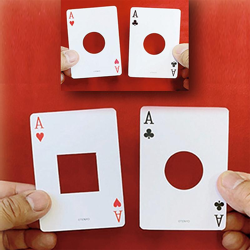 Magician displays 2 cards, each card has a round hole at the center.