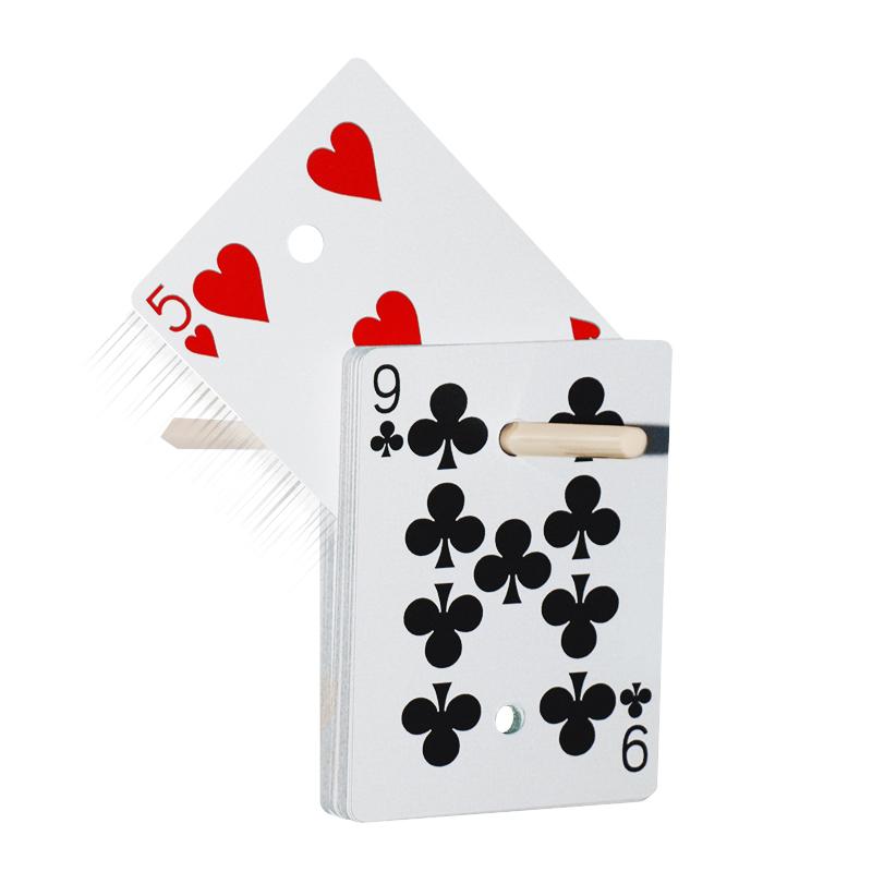 Show a deck of cards with two holes and a Chinese stick. Insert the stick in one hole of the deck and making it slide back and forth, show that all cards are punched. Do the same thing in the other hole, put away the stick, shuffle the cards and make chose one card freely. The spectator looks at his card, then he puts it anyway in the deck. At this point insert the stick in one hole and holding it by the end let the deck hang in the stick. Cover the deck with a silk, ask the spectator which is the chosen card and… magically the card will come out from the deck.