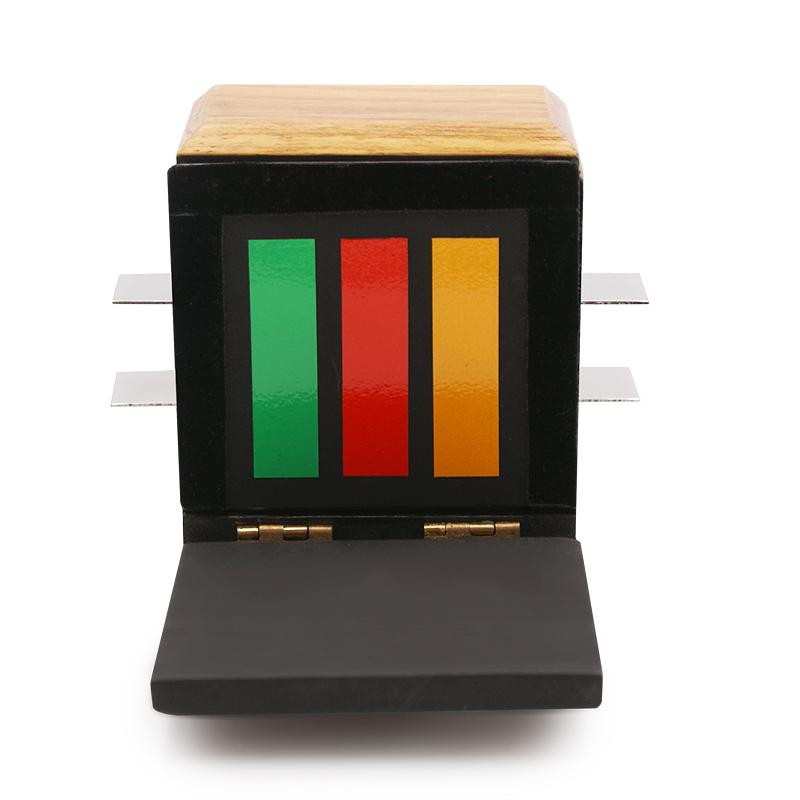 Zobacz pudełko z trzema kolorowymi blokami, z dwoma szczelinami i dwiema ostrzami. Umieść bloki wewnątrz pudełka i przesuń przez ostrza, aby je zablokować. Otwórz drzwi pudełka, aby pokazać, że zamki są w miejscu.