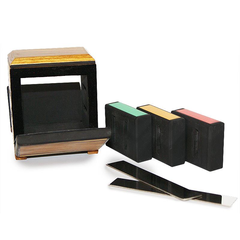 - Pudełko i bloki wykonane są z dbałością o detale z drewna. Ostrza są wykonane ze stali.