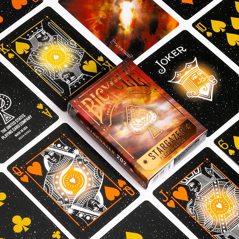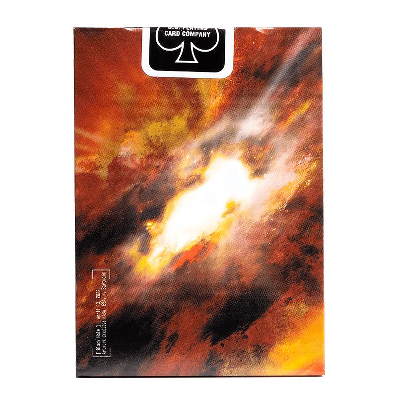 Embark on a cosmic adventure with Bicycle Stargazer 202. Gaze into the destructive depths of a Black Hole on every card back with photography captured by the Hubble Telescope on April 13, 2022. With constellation-inspired court card designs, and an orange-foil inlayed tuck, you'll be dealing out a universe of entertainment.