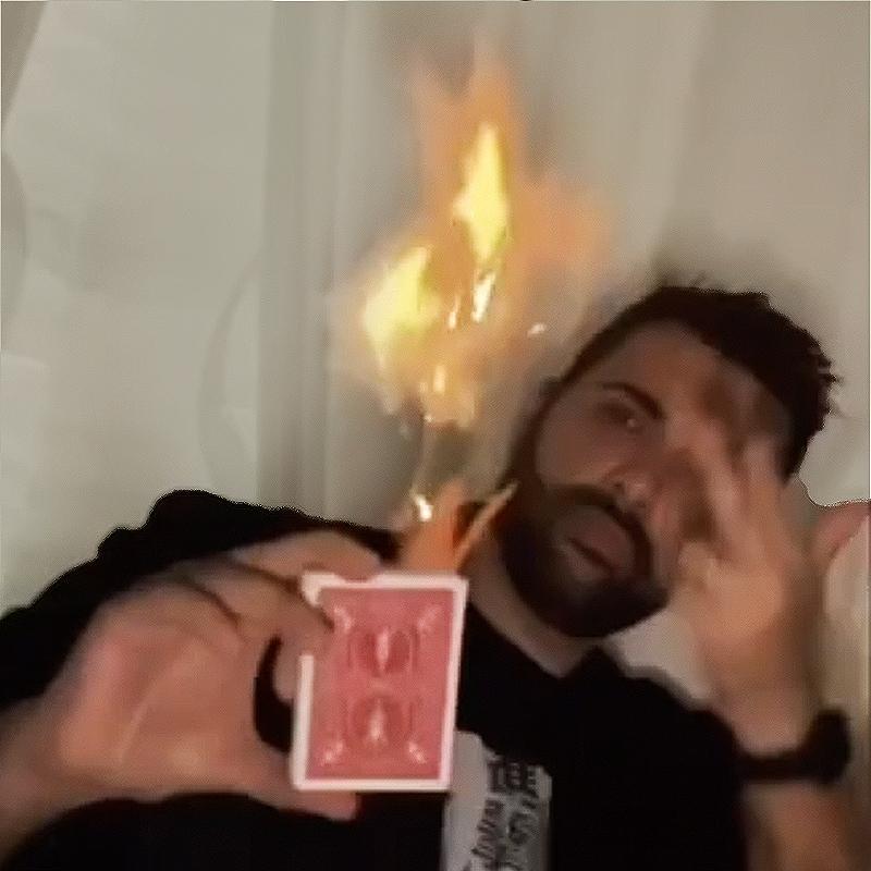 Effect 1 - A card is chosen and shuffled into the deck. You claim that the card will jump into the air. You position the deck to perform the classic card throw, but instead of the card coming out, there will be an explosion: the card has “jumped into the air,” but in an explosion! Open the deck and show that the spectator’s card is burnt! Leave it as a perfect magical souvenir!