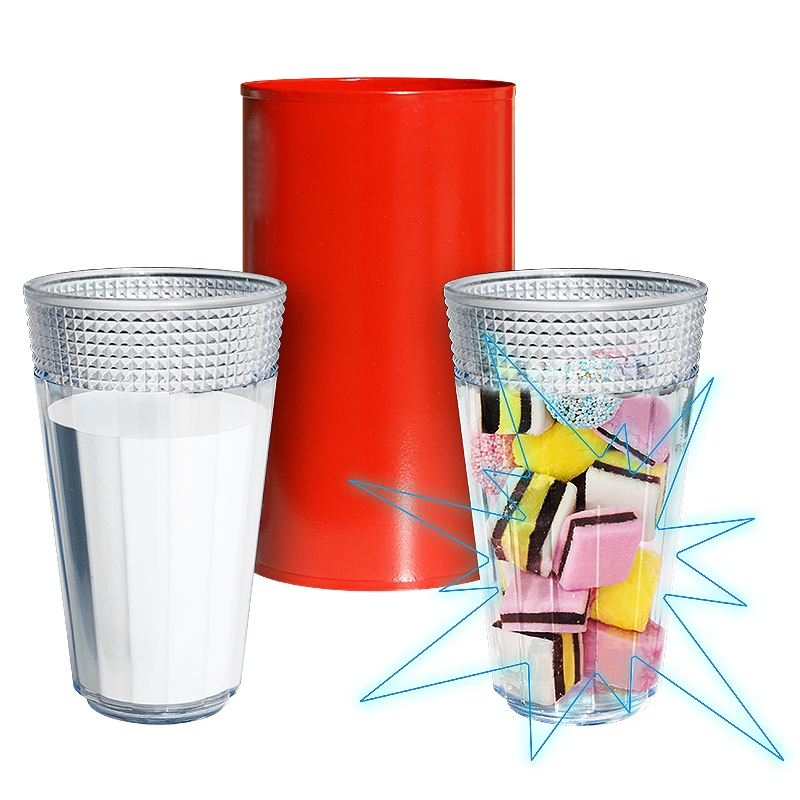 The performer shows an empty cylinder and a glass full of coloured liquid or milk. The performer then passes the glass through the cylinder. The glass comes out filled with candy!