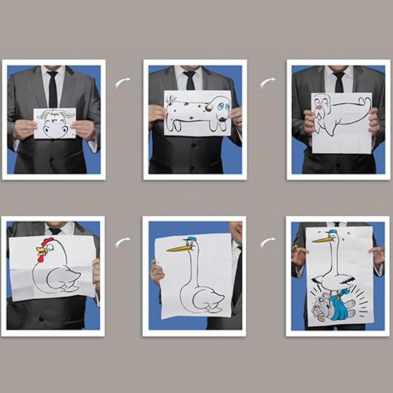 Every time you open the paper, it gets bigger and the illustration magically changes. The audience sees the rabbit transform into a puppy, which grows into a dachshund, which grows into a seal, which grows into a chicken, and then into a stork.