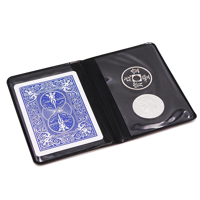 The magician shows a small wallet containing a playing card, a half dollar coin, and a Chinese coin that has a hole in it. He takes out the card and the half dollar, leaving the Chinese coin in the wallet. He puts the half dollar on the wallet, taps it with the card instantly and visibly changing it into the Chinese coin! When the wallet is opened, the half dollar is found inside.