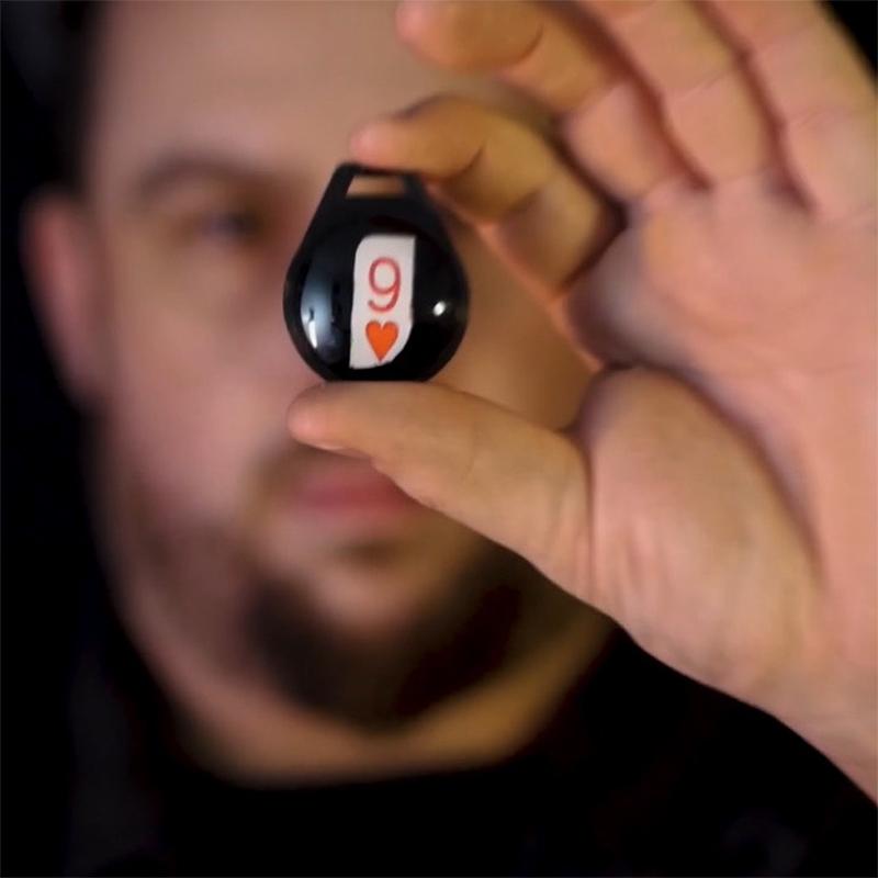 You show a black keychain made with a glass dome to the spectator and you explain that this keychain can catch his thoughts. The spectator picks a card in the deck, remembers it and puts it back into the deck. Then you ask him to imagine that he mentally cut a corner of his card and threw it into the keychain while you are shaking it and magically the corner will appear in the keychain!! Then you go through the deck, and you see a card without a corner, you turn it face up, it’s insane! This is the spectator’s card and the corner in the keychain matches with the card. You can give the keychain to examination.