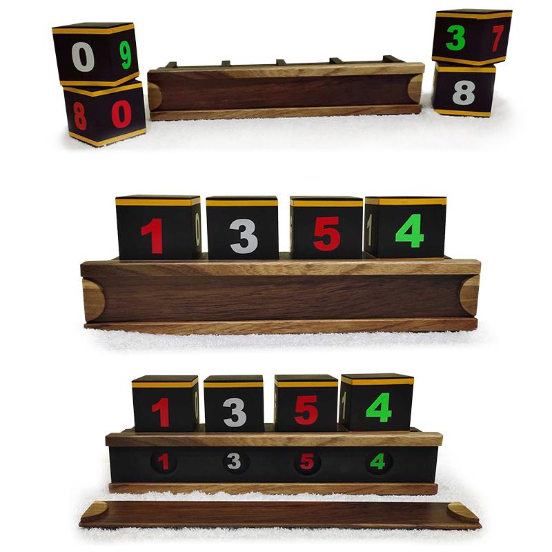 You show four cubes from all sides showing each cube having different color numbers on all sides and a stand to place the four cubes on it. There is a sliding panel in front of the stand, you say that you have already predicted the numbers and colors which the spectators are going to choose!