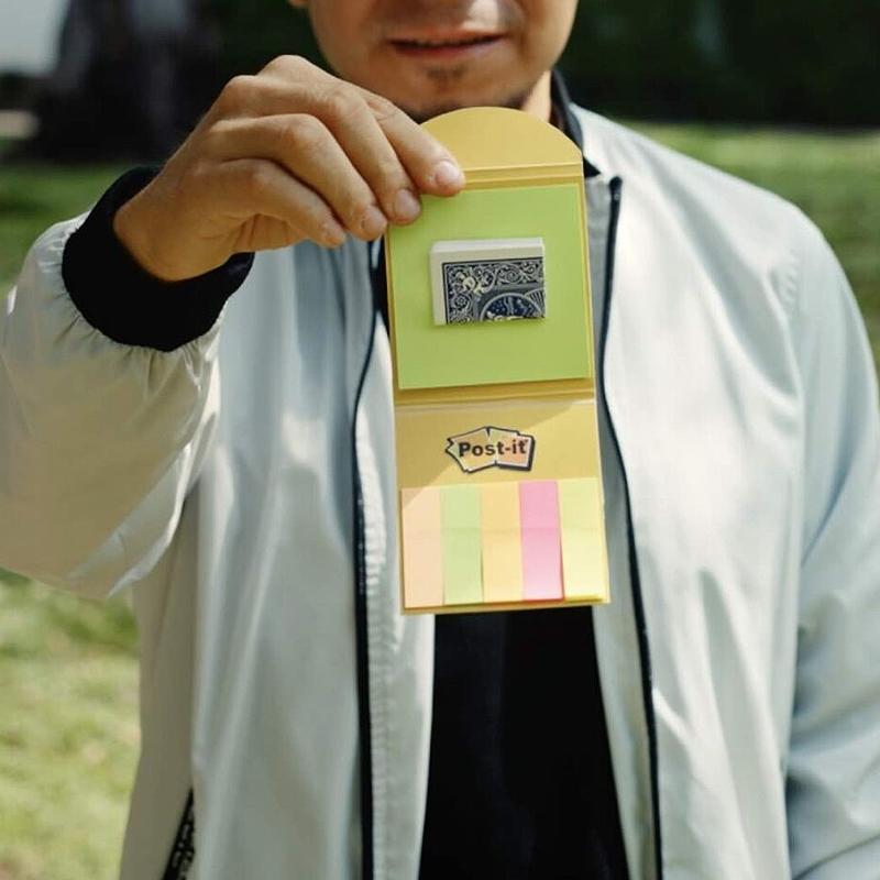 The magician asks someone to choose a card. So the magician focuses and tries to read in his mind and decides to write a card on a post-it, but when the post is shown, this is not the chosen card. Don't worry, now the magician shakes the block of post-it and in the blink of an eye the written card turns into that choice.
