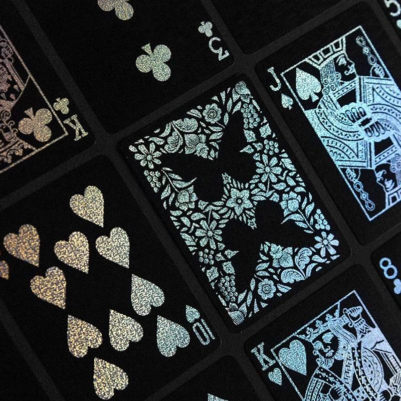 To complete the whole aesthetic, the cards have matte black gilding. The gilding helps the backs transit to the faces flawlessly and makes the holographic foil stand out.