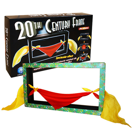 The magician shows a rectangular frame and tucks two silks of the same color in two small holes that are in its opposite ends. He then places a balloon in the center of the frame between the silks. A different colored silk is magically made to vanish. The magician then takes a long pin and pops the balloon. To everybody's surprise the vanished silk instantly reappears tied between the silks that had been placed in the frame before. - The item measures cm 44(17,3”) x 25(9,8”) x 7(2,8”), and is supplied with the necessary silks, with the special gimmick to make a large silk vanish and with 10 balloons.