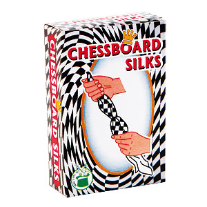 The magician, passing his hand up and down over the two silks, makes them change to a chessboard design. Easy to do.