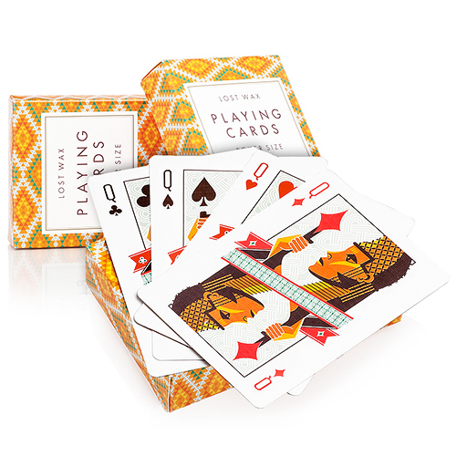 Każdy zestaw Lost Wax to 54 karty ilustrowane królewskimi figurami z Imperum Benin, od 15 do 19 wieku.Imperium Benin rozwijało się w miejscu obecnej Nigerii, i pozostawiło po sobie imponujący ślad w postaci wykonanych z brązu tabliczek, których wykonanie zlecił Król (Oba), aby upiększyły podwórka jego pałacu.Te karty to hołd dla tego okresu dobrobytu w dziejach Nigerii, i tym samym na nowo przywracają do życia tę dawno minioną erę w kolorowy, luźny sposób.Obrazy przedstawione na kartach ociekają historycznym symbolizmem. Przykładowo, na figurach znajdują się symbole 4 zasłużonych benińskich królów, 4 królowych-matek oraz 4 waletów - królewskich służących. Rzeźby które były inspiracją dla tej talii zostały stworzone w hołdzie królewskim przodkom z Imperium Benin. Również as pik posiada historyczną wartość. Prezentuje króla w formie rybonogiej postaci. Można zinterpretować to jako kosmologiczny obraz połączenia między królem Benin, władcą suchego lądy, i bóstwem Olokun - Bogiem wielkiej wody.Te kart wprowadzają dynamikę do nigeriańskiej świadomości i kultury. Na współczesnych nigeryjczyków coraz większy wpływ ma popkultura, a nie rdzenne tradycje. Tradycyjne symbole, takie jak te karty, przypominają dawną Afrykę, jej złote czasy i artefakty. Może jeśli dawny dobrobyt Nigerii stanie się wiedzą powszechną, również jej przyszłość będzie bardziej optymistyczna?Każda talia wydrukowana przez USPCC.-Rozmiar pokerowy.