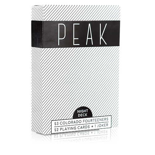 Beautifully designed playing cards showcasing all of Colorado's 14ers, proudly made in the U.S.A. Peak Playing Cards beautifully illustrates each of Colorado's fifty-three 14ers, which are mountains rising at least 14,000 feet above sea level. Each back features the summit of a mountain peeking through the clouds, surrounded by rays of sun or shining stars. Each includes all fifty-three custom designed fronts that feature Colorado's 14ers. Both are symmetrical over the horizontal axis, so nobody will know how you hold the cards in your hand. All fifty-two playing cards and one Joker have a custom illustration of the peak of the 14er, as well as its name and elevation. The cards are ordered according to elevation; the highest peaks are aces and the lowest twos and a joker. Each card uses clean lines and lots of white space to showcase the modern design of the peak. 53 Fourteeners = 52 playing cards + 1 Joker. The other Joker is a custom design featuring Red Rocks. One blank card included. The suits are also a completely custom design. The font for the pips is modern, thin, and pairs well with the mountain design. The direction of the lines for the hearts/diamonds and clubs/spades lean opposite directions, making it easy to quickly distinguish between suits of the same color. The cards are beautiful to look at, but also easy to play with. Peak Playing Cards will be printed by the U.S. Playing Card Company (USPCC). This means exceptional quality used by the pros, all made in the USA. - The cards are poker size. - Air-cushioned finish for easy dealing and handling. - Card paper stock is crafted from sustainable forest paper, starch-based laminating glue, and vegetable-based printing inks.